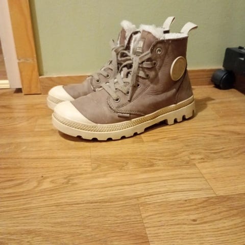 Harmaat nahkaiset palladium talvikengät, waterpoorf. Karvavuori jo käytössä painunut mutta vielä leudoille keleille hyvät