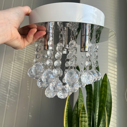 Säihkyvässä Madelene kattoplafondissa on kauniisti hiotut akryylikoristeprismat ja kromattu runko. Asennusta helpottaa kattokoukkukiinnitys.