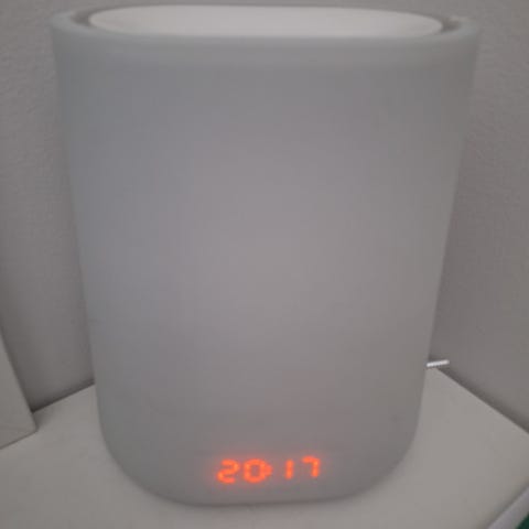 Philips herätysvalo ja pöytälamppu. Laitteessa on pyöreä kupu, joka toimii valonlähteenä sekä digitaalinäyttö, josta näkyy kellonaika. Herätysvalossa on säätöpainikkeet etupaneelissa ja virtajohto mukana. Soveltuu käytettäväksi herätysvalona makuuhuoneessa tai himmennettävänä tunnelmavalona pöydällä.