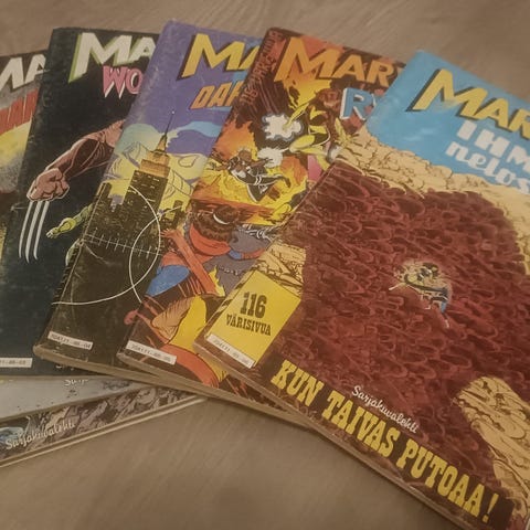 8kpl, pyhimys, Marvel ihme neloset,Hopeanuoli, hämähäkkimies nro.5-89, Mustanaamio nro 15-84 ja nro 3-93, Marvel hurjapää. Ja joku uudempi spiidermanni hulk/Wolverine. Tarjoo jos vaikka sattus heikko päivä. Ehkäpä jopa yxitellen...