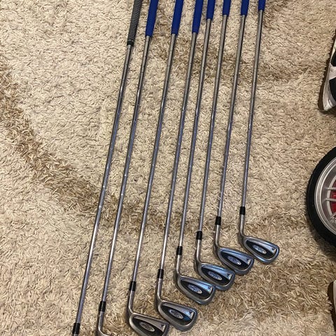 Hyvä rautasetti regular-varsilla seuraavalle. Gripit pesty säännöllisesti, joten hyvässä kunnossa. Lyöntipinnoissa ja lapojen pohjissa normaalia kulumaa ilman suurempia kolhuja. Poikkeuksena 9 alareunassa oleva kolhu, näkyy lisäkuvassa. Lisäksi 6 varren kiinnityskohdasta puuttuu muovirengas, mikä toki vain kosmeettinen virhe.