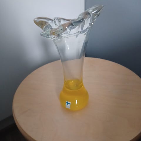 Maljakko, kuviollinen lasi, siistissä kunnossa. Mitat: korkeus 25cm halkaisija 12,5cm.
