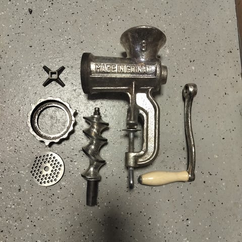 Lihamylly metallinen. Käsikäyttöinen pöytään kiinnitettävä malli, jossa kampi puukahvalla. Mukana useita irrotettavia osia, kuten ruuvi, terä, reikälevy sekä muovisia lisäosia esimerkiksi makkaranvalmistukseen. Soveltuu lihan ja muiden raaka-aineiden jauhamiseen keittiössä.