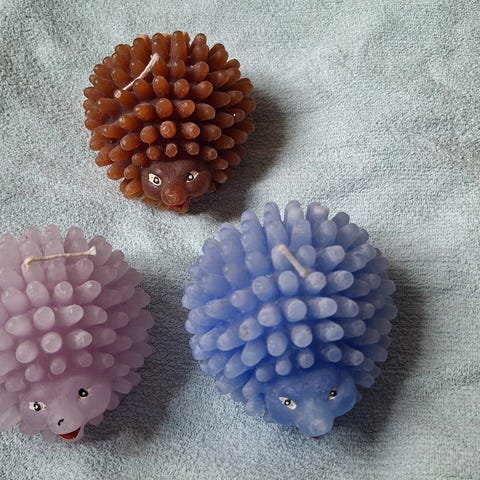 Kolme saman sarjan siilifiguuria. Yhden nenänpäästä maali hieman hilseillyt, ei muita vikoja.