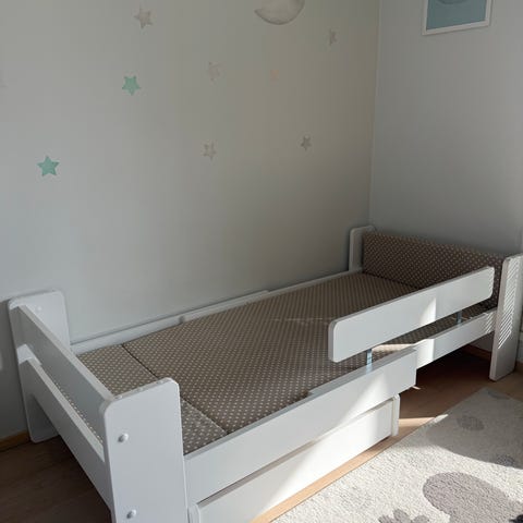 Settiin kuuluu päätyhyllykkö, turvalaita, sängynaluslaatikko sekä laadukas Familion smart lastenpatja jatkopalalla (75x130cm+30cm). Patja siisti ja puhdas, yhdellä lapsella käytetty ja aina kosteussuojan kanssa. Patjan ovh 325 €.