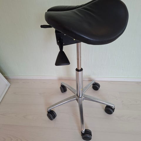 Salli Slim Swing satulatuoli. Minimi istumakorkeus noin 65cm, maksimi 89cm, kätevästi vivusta tapahtuva nosto/lasku. Maksimipaino 100kg. Jalustassa on Sallin hyvin rullaavat pyörät ja ristikossa nystyröitä, joihin voi vaikka hieroa jalkapohjia. Mukava istua, mutta seison työpöydän ääressä mieluummin, siksi myyntiin.