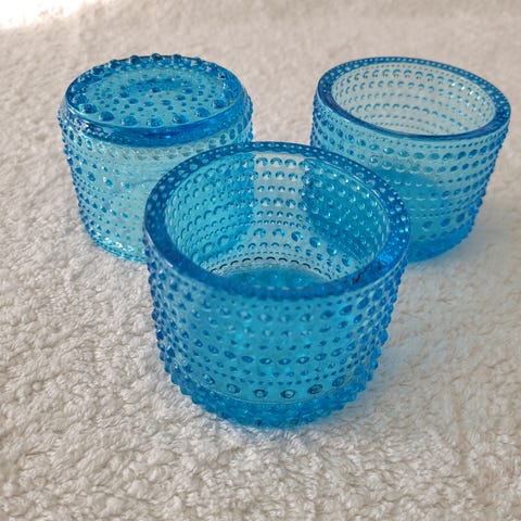 Iittala Kastehelmi tuikkukupit kirkasta lasia. Pintaa koristaa Kastehelmi-sarjalle tyypillinen kohokuvioinen pisarakuvioreliefi. Sopivat tuikkukynttilöille ja pienten asetelmien tai kattauksen osaksi.