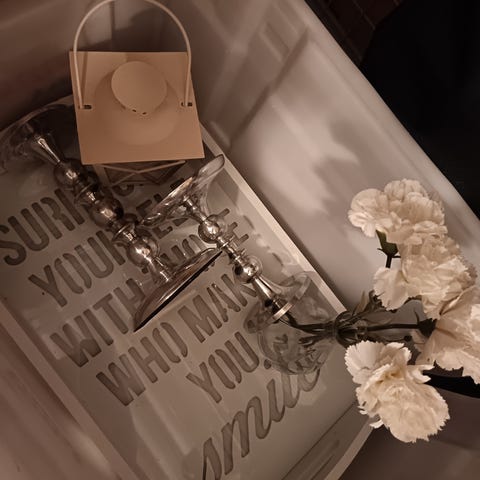Pöytäkynttilät ja tarjotin vaaleissa sävyissä