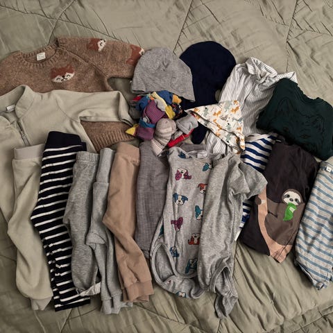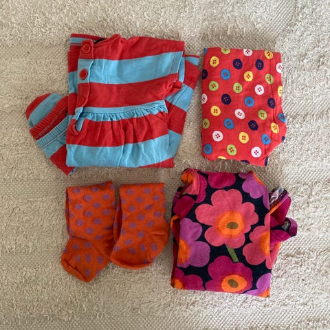 Kiva setti Marimekkoa seuraavalle pienelle. (Meillä vaatteet olivat käytössä kokoja 74 ja 80 käyttävällä.) Hyvä käytetty kunto. Minun nenääni ei osu mitään tuoksuja enkä löytänyt isoja tahroja tai reikiä tms. moitetta.