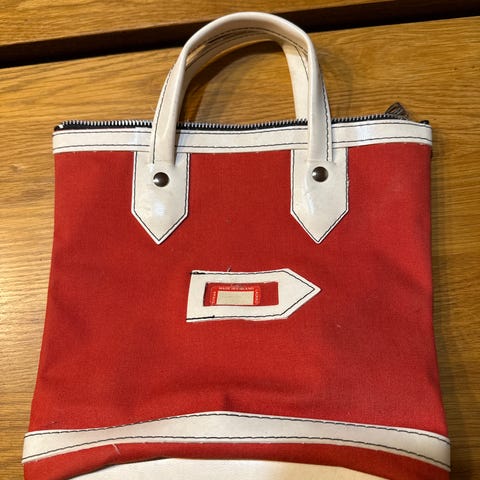 Harmaa-valkoinen retrohenkinen jenkkikassi. Kotimaista tuotantoa. Käyttämätön, mutta säilytyksessä tullut pieniä painauma valkoisiin kahvaosiin. Vetoketjulla suljettava.