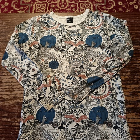 Aarrelabel pantteri mekko 122/128cm. Joustava laadukas kangas ja ainakin meille merkin tapaan vähän reiluhko koko. Väri vähän meleerattu/haalistettu. Pari kertaa pidetty siisti käytetty. Vähän pesuhaihtua, käytönjälkeä tai haalistumista voi olla parin pesun verran.