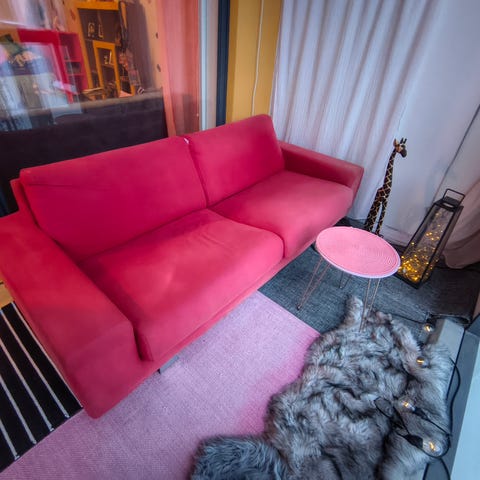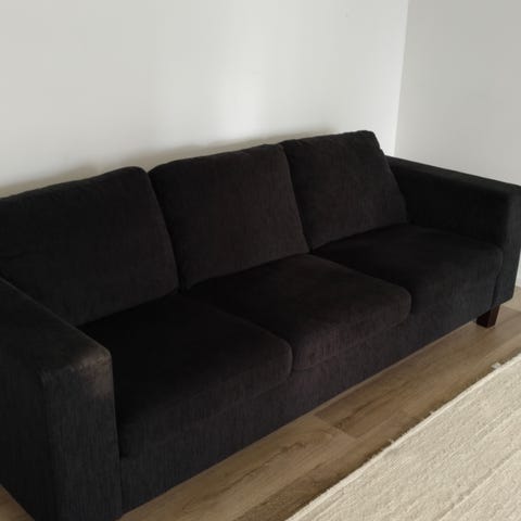 Tukeva ja laadukas sohva. Istuinosa 154 cm leveä. Pehmusteet ja runko erinomaisessa kunnossa. Kangas kärsinyt kissoista (raapimisjälkeä päädyssä) ja lapsista (tahroja). Keskellä pehmusteiden välissä repeämä.