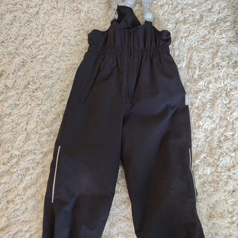 Reima lasten toppahousut, koko 110. Väri musta. Housuissa on korkea vyötärö, edessä vetoketju ja säädettävät olkaimet. Lahkeensuissa on kuminauhat ja jalkalenkit, jotka auttavat pitämään lahkeet paikoillaan. Polvissa hiukan kulumaa ja pehmeymää, joka kuvassa korostuu ehkä vähän enemmän kuin oikeasti onkaan.