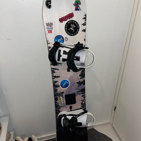 Laudassa hieman kulumaa pinnassa, pohjan kunto hyvä, kevyitä naarmuja, ei kummempaa. Pohjan muoto näyttäisi olevan Camber. Samalla voi ostaa myös siteet 30€ tai myös lyhyemmän laudan, toinen ilmoitus