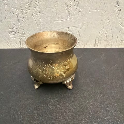 Kauha tai pannu, jossa on musta kahva. Kulhomainen osa on uritettu ja pyöristetty, ja sen pinta on patinoitunut käytöstä. Pohjassa on leima tai merkintä. Kauhan paino on noin 74 grammaa. Sopii esimerkiksi keittiö- tai tarjoilukäyttöön tai koriste-esineeksi.