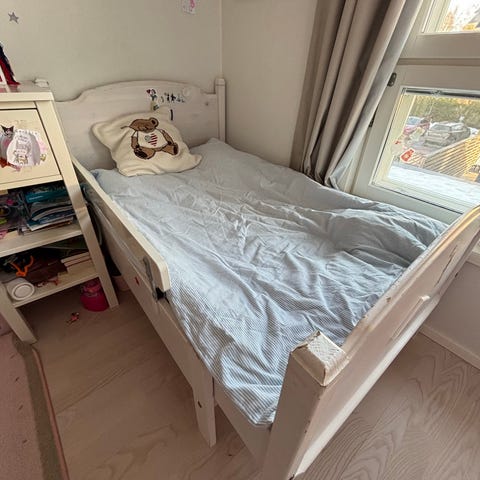 Laadukas ja ajaton kokopuinen Veken jatkettava lastensänky säleikköpohjalla. Valkoinen puinen runko, jossa laidat kummallakin sivulla. Sänkyä voi pidentää lapsen kasvaessa 100-189 cm. Sängyn alla säilytyslaatikko pyörillä leluille. Ollut yhdellä lapsella käytössä, vähäisiä käytönjälkiä/kulumaa. Patjan saa halutessaan mukaan (sis. jatkopalan).