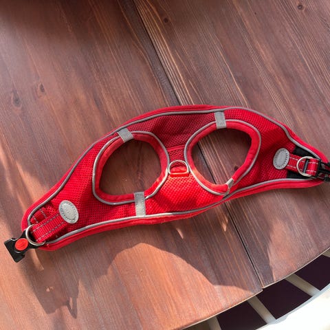 4DOG Comfort Walk Air -valjaat, koiran takki ja kantolaukku pienelle koiralle. Valjaat ovat punaiset, pehmustetut ja säädettävät, ja niissä on heijastavia yksityiskohtia sekä D-lenkki talutinta varten. Koiran takki on violetti vetoketjukiinnityksellä ja säädettävillä hihnoilla, sopii pienikokoiselle koiralle. Harmaa kantolaukku on pehmeärakenteinen ja siinä on olkahihnat kantamista varten. Pienelle koiralle kuten chihulle.