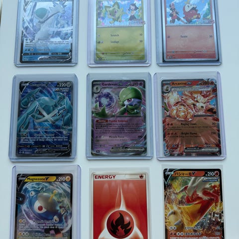 Kortit vedetty suoraan Scarlet & Violet Base Set Booster boxista sliiveihin 4.3 ja nopat Phantasmal Flames ETB:stä