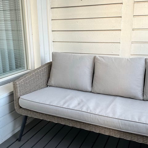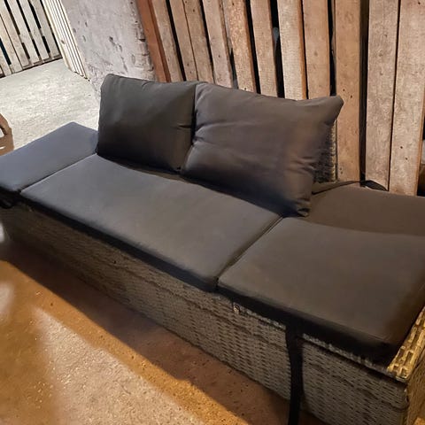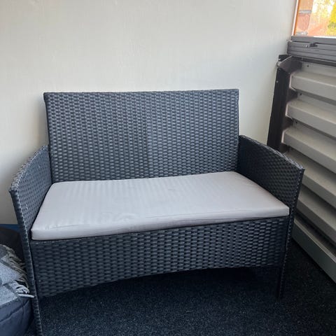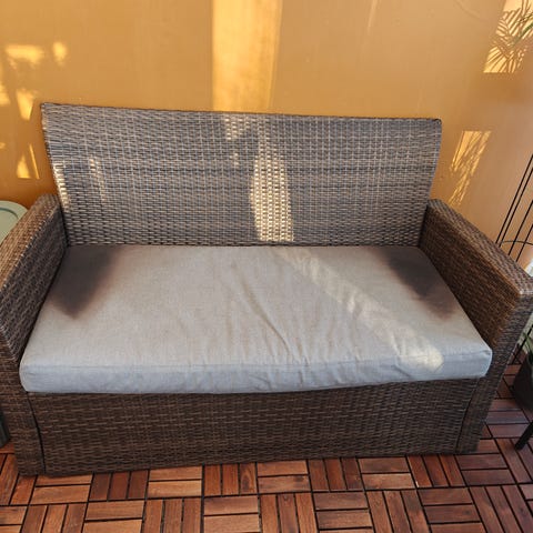 Myydään tyylikäs ja hyväkuntoinen polyrottinkinen parvekesohva.