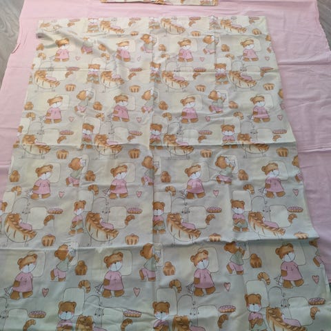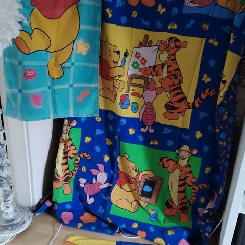 Verhosetti ja valaisinvarjostin, joissa pöllöaiheinen kuosi sekä pöllöaiheinen pussilakana.