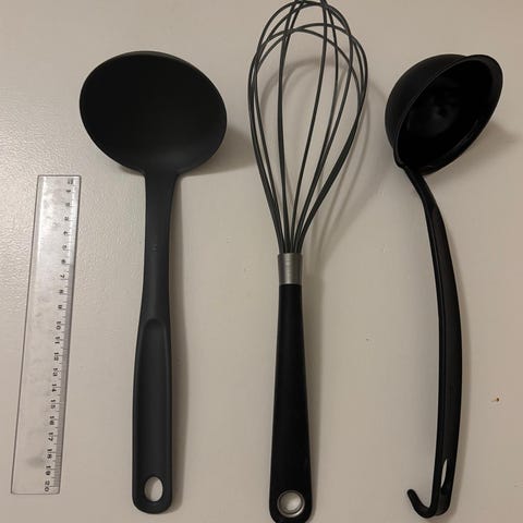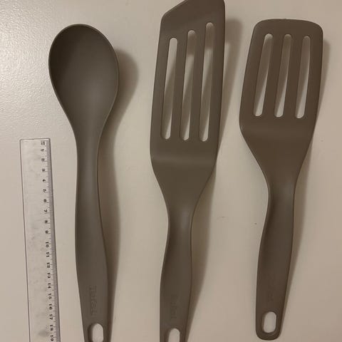 Keittiövälineet, joihin kuuluu kaksi puista työvälinettä (lastamainen ja haarukkamainen) sekä puuvarrellinen silikoninuolija turkoosilla päällä. Välineet soveltuvat ruoanlaittoon ja leivontaan, ja puumateriaali on hellävarainen pinnoitetuille pannuille ja kattiloille. Mukana kuvissa mitta-asteikko pituuden hahmottamista varten.