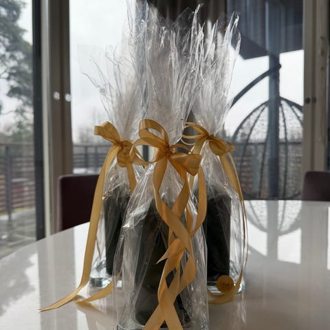 Kirjavan hillityistä väreistä tehdyt pyyhkeet lahjapakettina. Pakkauksessa kylpypyyhe ja käsipyyhe.