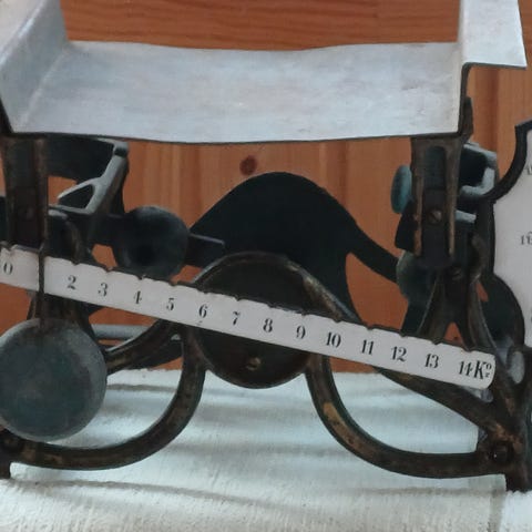 Jugend tyyppinen valurautainen talousvaaka. Ollut koristeena tai pienesineiden säilytyspaikkana. Toimii toki vaakanakin edelleen. Melko painava.