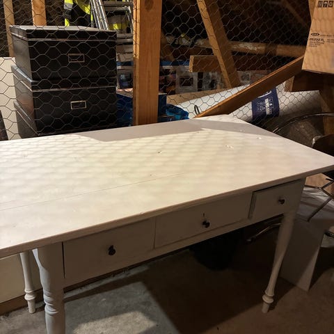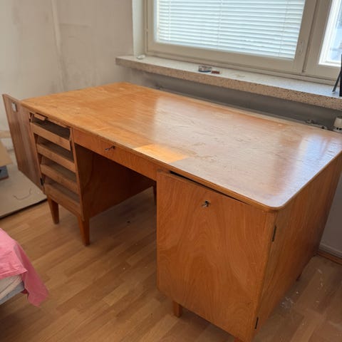 Superihana valkoinen retro peilipöytä. Pöydässä on 4 isoa vetolaatikkoa, 6 avohyllyä, päällä taso joka toimii tällä hetkellä hyllynä laukuilleni, iso peili ja peilivalo. Yleisilme tosi hyvä, mutta vintage ikä ihanasti näkyy pienissä jäljissä yms😊
