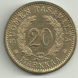 Suomen tasavallan 20 markkaa kolikko vuodelta 1956 leimakiiltoinen. Toisella puolella teksti "SUOMEN TASAVALTA", vuosiluku 1956 ja vaakunaleijona, toisella puolella nimellisarvo 20 MARKKAA ja puuaiheinen kuvio. Sopii esimerkiksi keräilyyn tai numismatiikasta kiinnostuneelle. hinta 5 e posti 2.50 e
