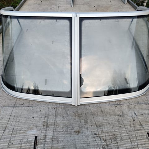 Uusi veneen tuulilasi. Keskellä ovi/kulkuaukko. Leveys 223cm, korkeus 28cm ja syvyys 240cm. Materiaali lasia. Voidaan myös vaihtaa akkuihin, alumiinivanteisiin, yms. Mielenkiintoiseen. Edullinen rahti voi myös onnistua.