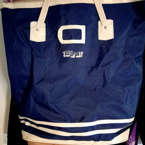 Vanha paljon käytetty kassi. Kulumaa, reikä. Kaikki vetoketjut toimivat, remmit ehjät.