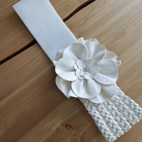 Oli tarkoitus kirjalla helmillä joissa läpi reikä ja tarkoitettu vaatteisiin jäänyt kirjailematta ja vyö käyttämättä joku voi jatkaa Ei ole ollut kertaakaan käytössä