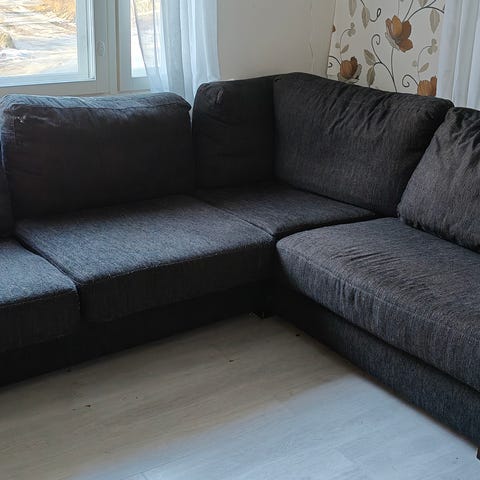 Annetaan IKEA sohva harmaalla kangasverhoilulla. Runko on vaaleaa puuta ja istuin- sekä selkänojaosat ovat pehmustetut. Mukana on irtotyynyjä samaa kangasta. Sohva soveltuu olohuoneeseen tai vierashuoneeseen istuma- ja lepokäyttöön. Muotoilu on pelkistetty ja suoraviivainen.