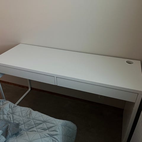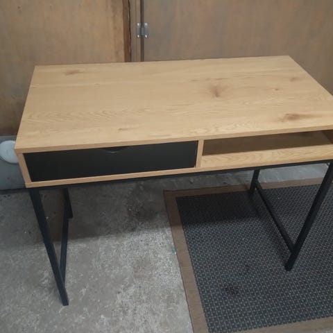 Työpöytä luukullisella/peilillisellä laatikolla. Pari pientä kolhua, mutta muuten hyvässä kunnossa.