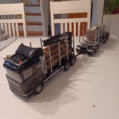 mummolakäytössä ollut EMEK Scania hiekkarekka. Rekan autossa ja peräkärryssä on kippitoiminto, perälauta avautuu. Rekan koko on: pituus 66 cm, korkeus 14cm ja leveys 10cm.