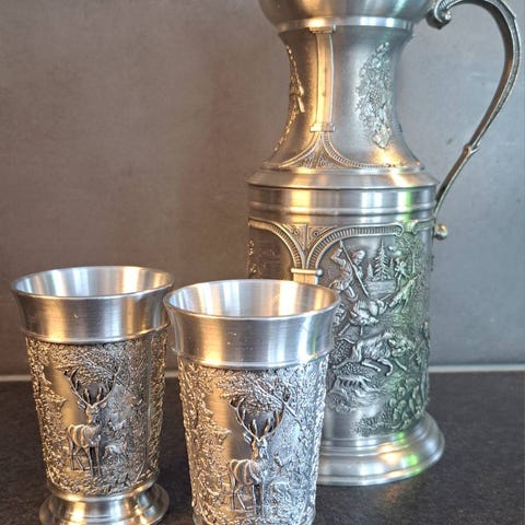 Snapsi tinapikarit korkeus 6,5cm, suuaukon halkaisija 4cm. Pohjassa teksti M sj Tin art 95% Sn. Norjalainen Pewter tinakannu, korkeus 17cm, vetoisuus 2,5dl. Yhteensä 28€