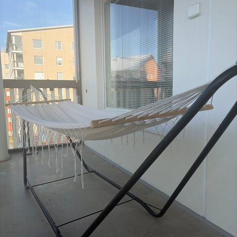 Siistikuntoinen ja ehjä Biltemasta ostettu riippumattoteline. Ollut sisällä/lasitetulla parvekkeella. Mitat löytyy kuvasta. Helppo purkaa kuljetusta varten. Toinen S-koukku puuttuu, löytyy rautakaupasta.