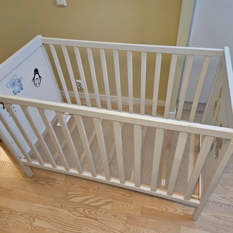 Valkoinen IKEA SUNDVIK -pinnasänky. 120x60 cm. Maalipinta hieman kulunut toiselta laidalta (kuva 2), mutta muuten erinomaisessa kunnossa. Pohjan korkeutta voi säätää. Mukaan matala vaihtolaita (kuva 3) ja patja, joka on puhdas ja hyvässä kunnossa.