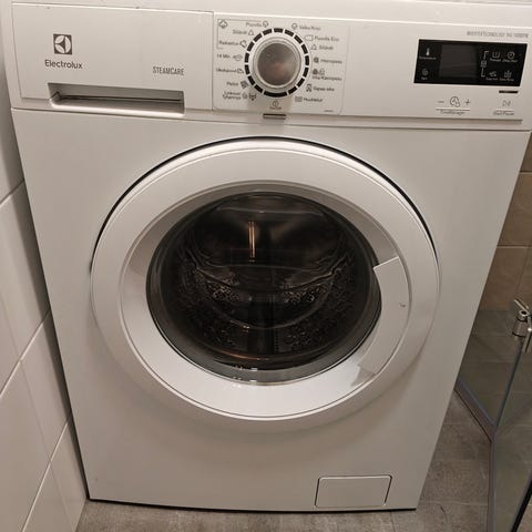 Etuluukullinen pesukone hyvässä toimintakunnossa. Pintaan on vuosien käytöstä tullut pieniä naarmuja, mutta kone toimii moitteettomasti.