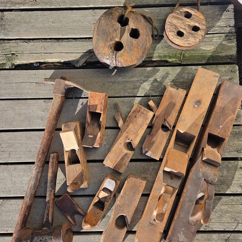Puuntyöstövälineitä. Yhdestä kahvasta puuttuu terä.