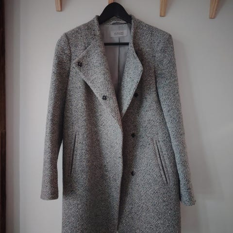 Acryli materiaalia oleva pitkä villatakki koko arviota S yksi nappi puuttuu alaosasta