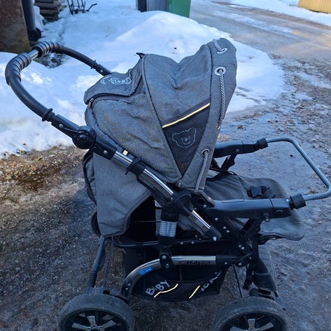 Bebe comfort merkki, kolmipyöräiset yhdistelmävaunut ruskea. Vaunuissa on etupyöränä yksi kääntyvä pyörä ja takana kaksi isompaa pyörää. Istuinosassa on säädettävä selkänoja, turvakaari ja viisipistevaljaat. Kuomu suojaa lasta ja siinä on tuuletusverkko. Alla on tavarakori pienten kantamusten kuljettamiseen. Mukana erillinen vaunukoppa, joka sopii vauvan kuljettamiseen myös autolla makuuasennossa. Vaunut soveltuvat lapsen kuljettamiseen eri maastoissa kolmipyöräisen rakenteen ja isojen pyörien ansiosta.