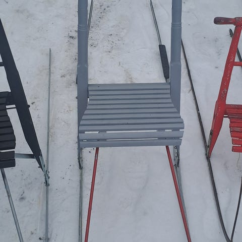 Esla potkukelkka talvikäyttöön. Kelkassa on metallirunko ja metalliset jalakset sekä puiset istuinrimat. Ohjaustanko on suora ja siinä on heijastin sivussa näkyvyyden parantamiseksi. Sopii liikkumiseen ja kuljettamiseen jäällä ja lumisilla teillä.Ollut aikuisen käytössä. Korkeus n. 77 cm, sopii parhaiten n. 160 cm pitkälle henkilölle. Jalakset ovat ruosteessa ja maalipinta hieman kärsinyt, muuten kunnossa.