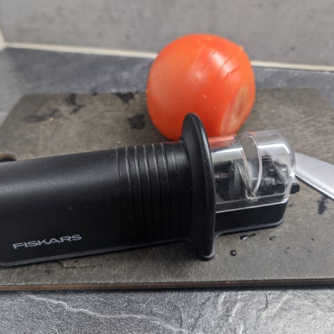 Todella hyvä veitsenteroitin. Fiskars on myynyt samanlaista mallia. Elixtähän saa vettä omaan kuppiin kiven alle ja veitset tulee todella teräviksi helposti.