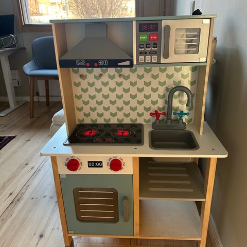 Leikkikeittiö, jossa liesi ja uuni, sekä useita leikkiruokia ja -tarvikkeita. Mukana on erilaisia hedelmiä, leivonnaisia, jäätelöitä, juomia ja keittiövälineitä. Osa tarvikkeista on puuta ja osa muovia. Sopii lasten roolileikkeihin ja keittiöleikkeihin sisäkäyttöön. Leikkipöytä kuuluu mukaan.