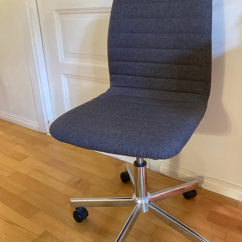 Jysk toimistotuoli, jossa harmaa kangasverhoiltu istuin ja selkänoja. Tuolissa on avoin selkänojan muotoilu ja käsinojat, jotka ovat osa yhtenäistä runkoa. Jalusta on valkoinen, metallinen ristikkojalka, jossa on viisi pyörää liikkumisen helpottamiseksi. Istuinkorkeutta voi säätää kaasujousella. Soveltuu työtuoliksi kotiin tai toimistoon työpöydän ääreen.