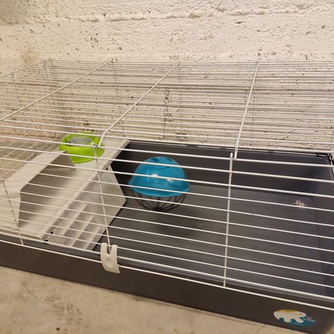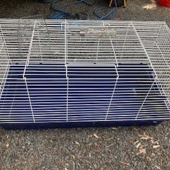 Pieneläinhäkki, jossa sininen muovipohja ja metallinen ritilärakenne. Häkissä on etuluukku ja päällä luukku sekä juomapullo ja ruokakuppi kiinnitettyinä ritilään. Koko P 119x L 59x K 47cm