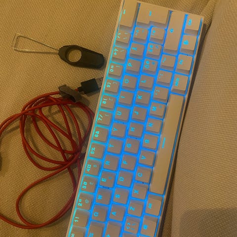 Monsgeek M1W langaton alumiinirunkoinen mekaaninen näppäimistö. Yhteys USB-C-johto/Bluetooth/2.4Ghz. Mukana tulee myös kuvassa näkyvät ylimääräiset näppäimistöhatut sekä työkalut näppäimistöhattujen ja kytkimien vaihtoon. Alkuperäistä pakkausta tai johtoa ei ole, mutta mikä tahansa USB-C tyyppinen käy lataamiseen/yhdistämiseen. Sisällä CS Jelly Black -kytkimet sekä M1 POM Plate.