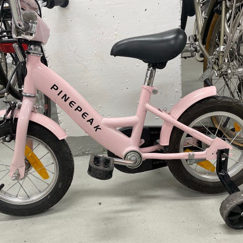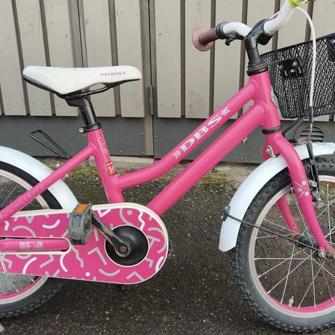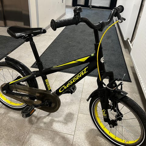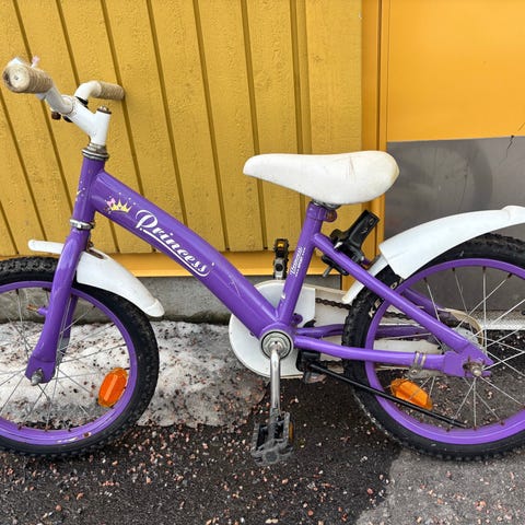 Crescent lastenpyörä 16" renkailla. Pyörässä on matala runko, jalkajarru ja etukäsijarru. Varusteluun kuuluu etukori ja tavarateline takana. Väri on pinkki, satulassa on kuviollinen harmaa/pinkki verhoilu. Sopii lapselle, joka käyttää 16 tuuman lastenpyörää.