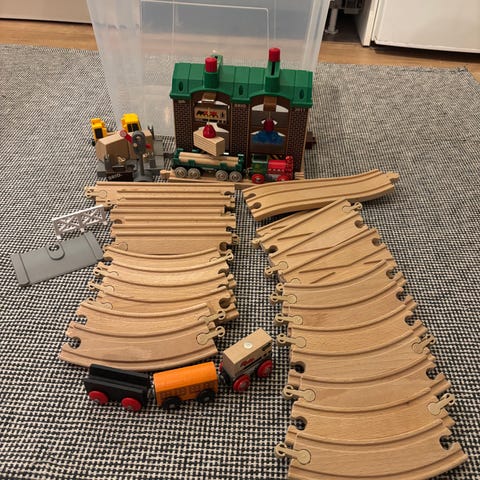 BRIO puinen junarata, parkkitalo ja lisäosat. Hieman Hape paloja mukana.